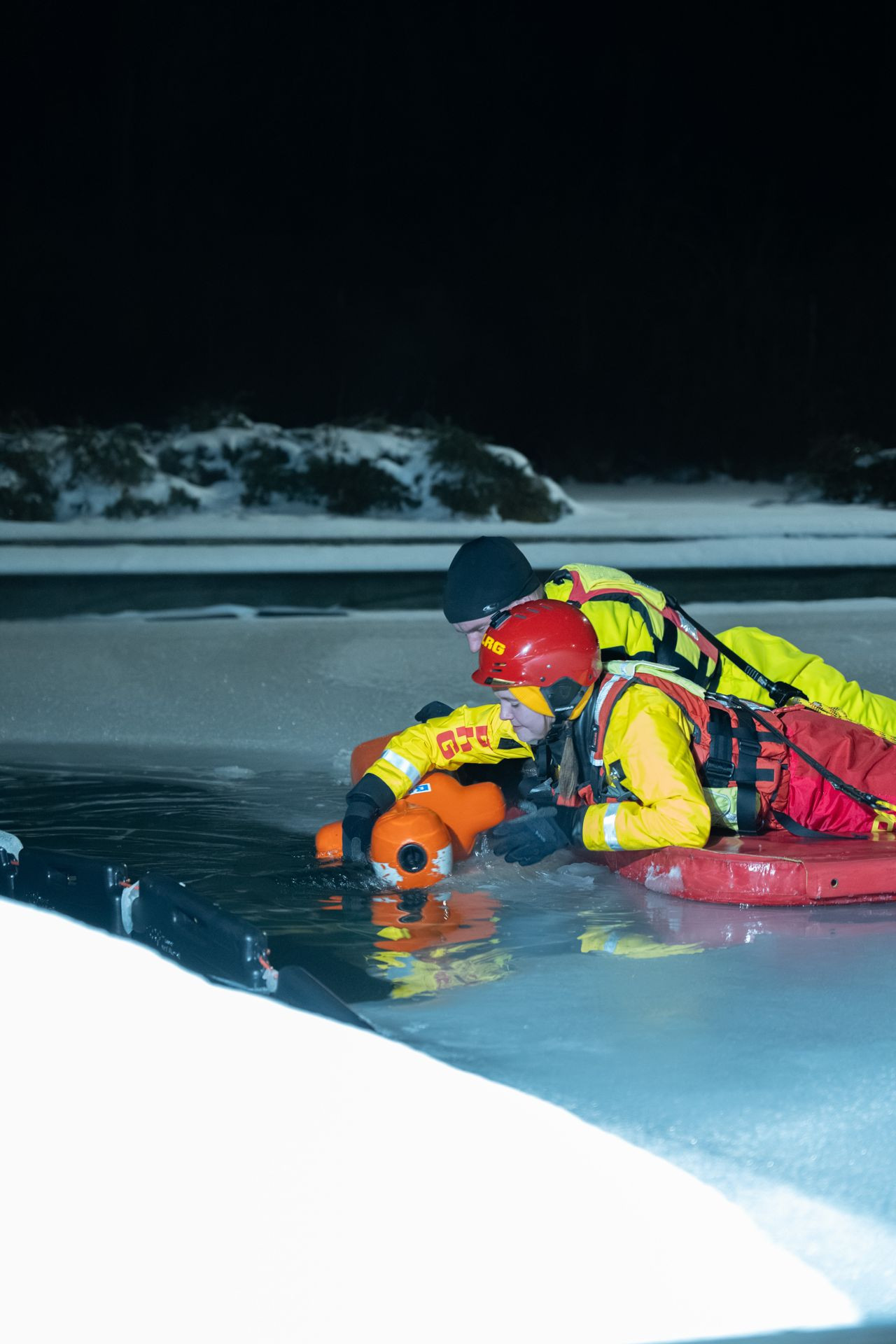 Der Test gestaltete sich durchaus schwierig: Durch die extrem niedrigen Temperaturen am Wochenende war die Eisschicht tragfähiger als erwartet. So mussten wir uns kurzerhand mit einem Betonfuß behelfen. Mit diesem gelang es uns, nach einiger Anstrengung ein Loch in das Eis zu brechen. So konnten wir nun zumindest zur zweiten unserer Fragen einige Antworten sammeln: Indem wir mit Matten oder unserem Spineboard (eine Art schwimmfähige Trage aus Hartplastik) Personen aus dem Eisloch gerettet haben. Ist die Person auf die Unterlage verbracht, können die Retter*innen mithilfe der Sicherungsleinen an Land gezogen werden. Hierbei erwies sich die Matte tatsächlich als einfacher in der Handhabung als das Spineboard, da diese auf dem Eis deutlich besser rutschte. Auch die benötigen Handgriffe zur Rettung und Absicherung konnten geübt und getestet werden.
